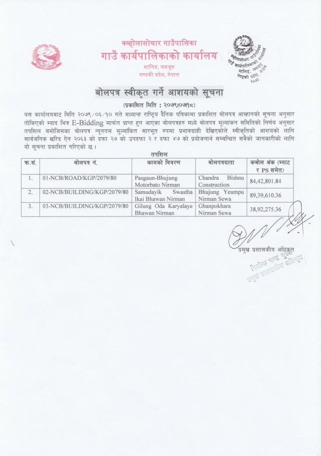 बोलपत्र स्वीकृत गर्ने आशयको सूचना